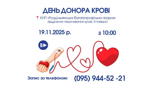 Запрошуємо всіх охочих долучитися до Дня донора крові, який відбудеться 19 листопада 2025 року на ...
