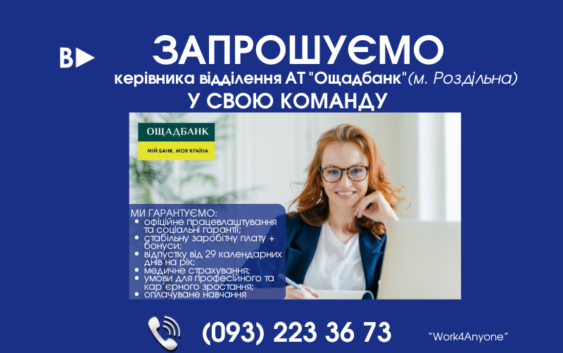 📣Увага! Відділення АТ “Ощадбанк” у м. Роздільна запрошує на роботу керівника відділення банку 👩💼👨💼